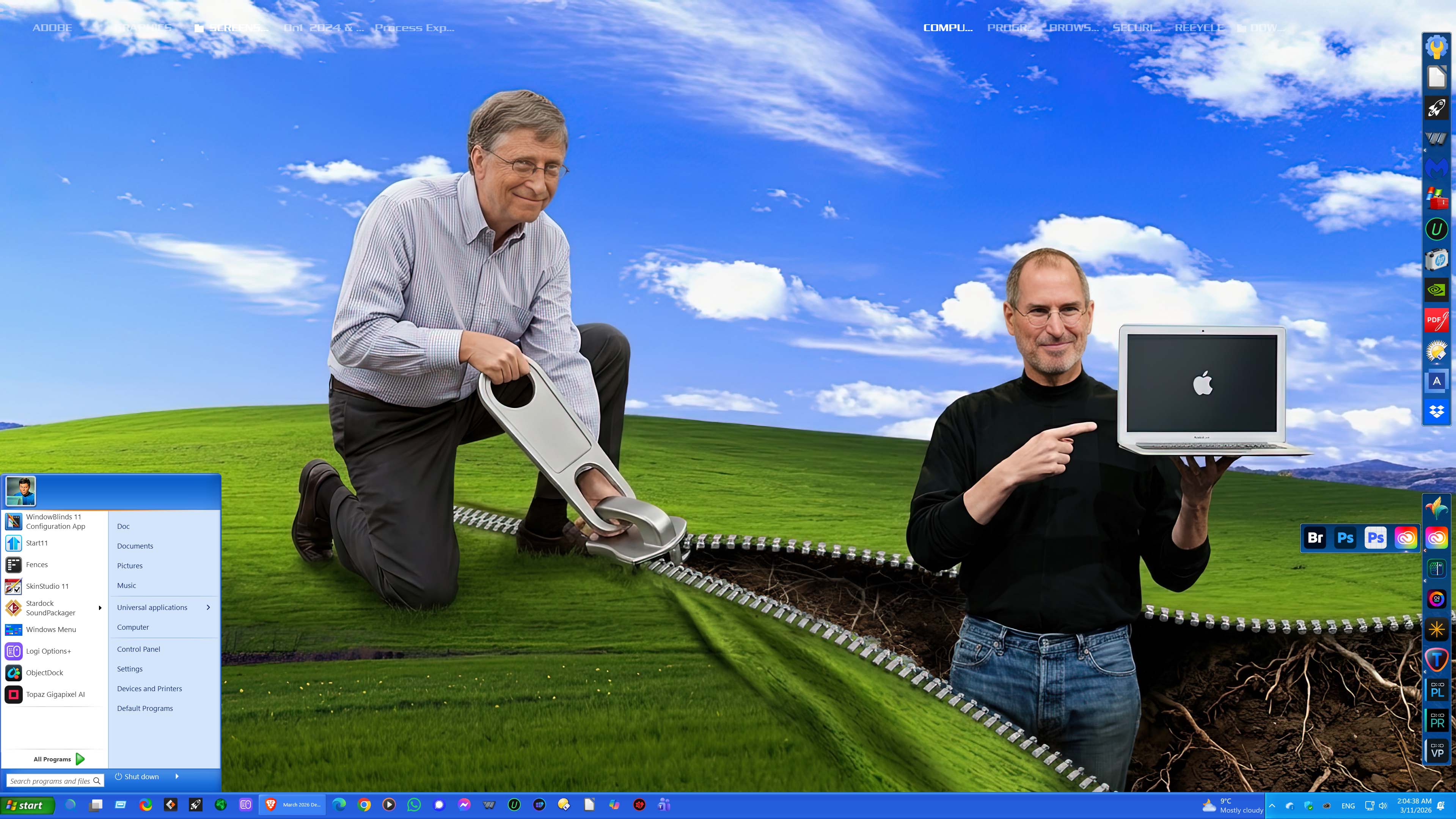 eXperience 11 by Simplex Designs with docks by him, as well. Wall is Bliss, from the net composited with the Beatles' Yellow Submarine. Fences 6, and Start11v2 in W7 start menu style.